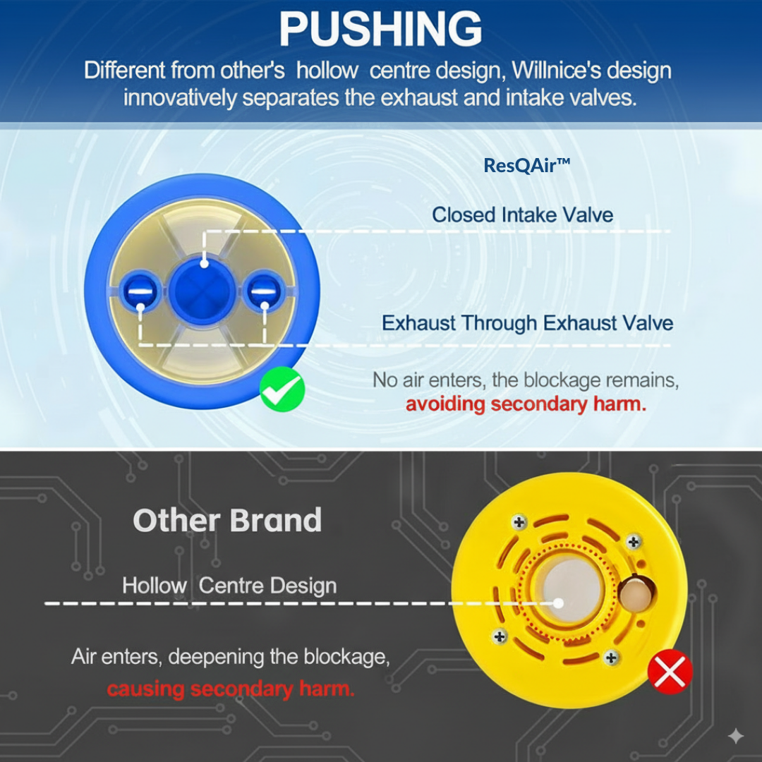 Its one-way suction mechanism ensures the obstruction moves only in one direction — OUT. No pressure on the chest, no invasive action, no risk of worsening the situation.